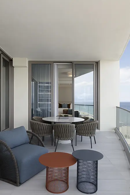 Finally, we designed this beautiful outdoor balcony for our clients to dine while enjoying the views. This space features a small round dining table coupled with padded chairs for al fresco meals.