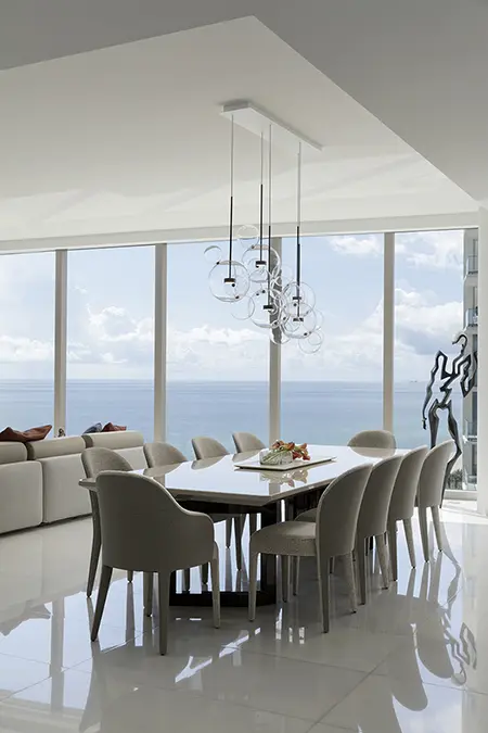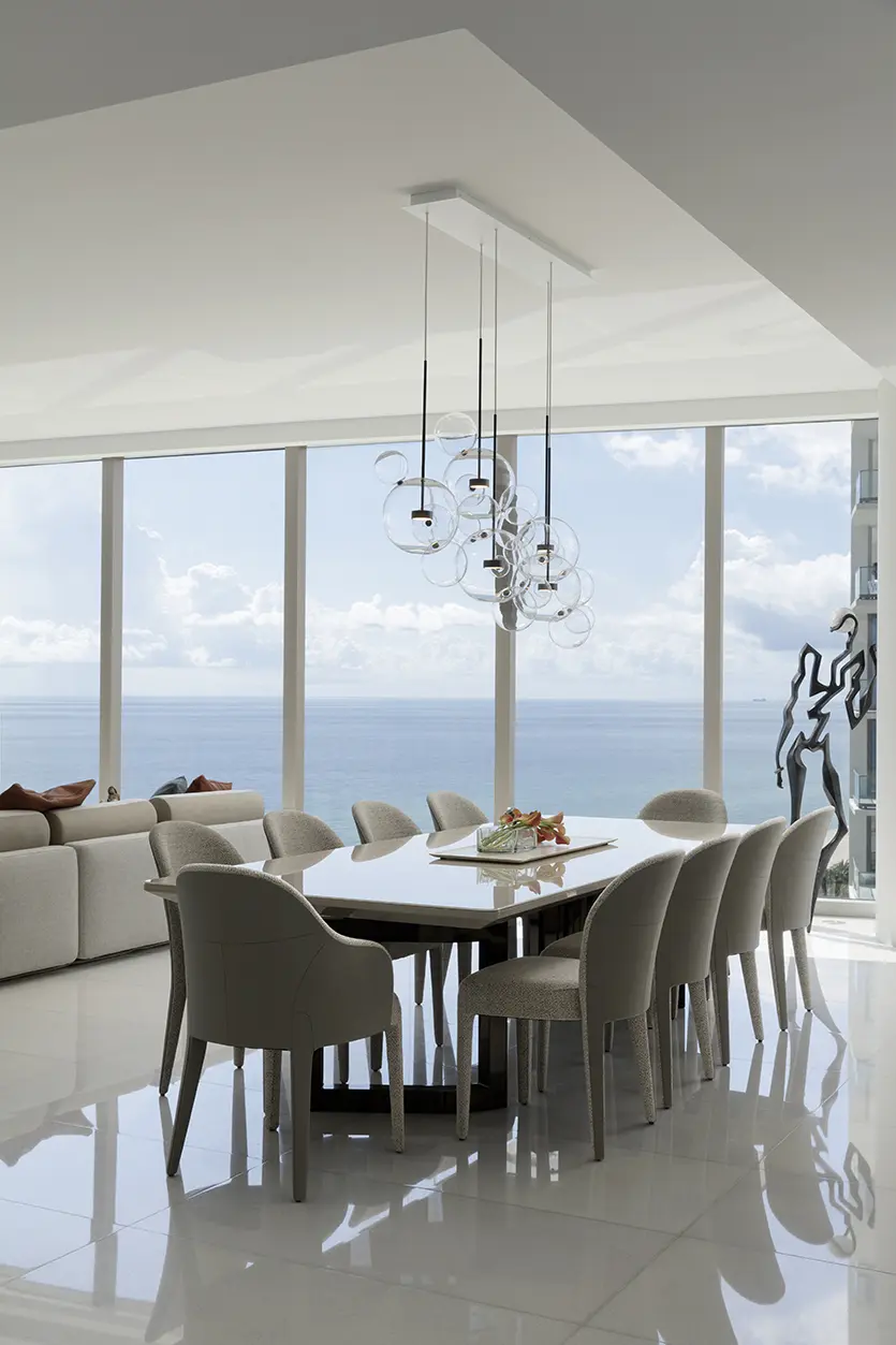 Next, step into the dining space. It is a bright and airy haven featuring reflective surfaces, glass, and light neutrals. While the ocean views are the focal point, you can’t miss the statement bubble chandelier above the large dining table. It is so light and airy that it almost blends into the clouds outside.