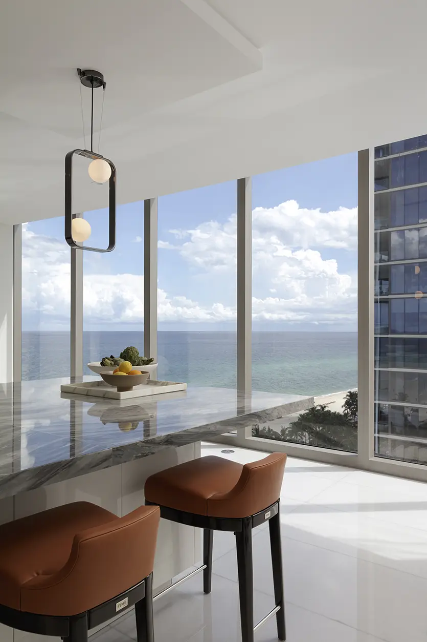 The light-filled kitchen was pre-existing with a fresh white foundation punctuated by contemporary accents. The statement stone on the kitchen island, brown bar chairs, and artistic pendant lights coordinate well with our design for the living room. We decided to add custom glass cabinetry doors to parallel the large windows, contributing to the open feeling throughout this oceanfront condo.