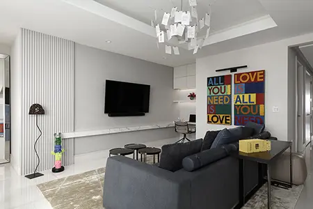 There are still upscale elements like the marble shelf below the mounted TV and unique textured wall paneling. However, the overall feel is more casual.
