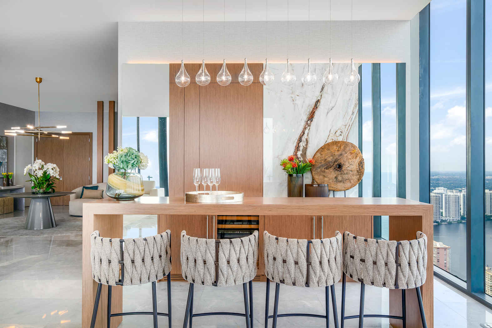 Para el dormitorio VIP, nuestros interioristas de West Palm Beach imaginaron un lujoso biombo de carpintería a medida con acabado en bronce como punto focal de la pared del cabecero. Combinado con elementos como la paleta de colores neutros y los tonos fuertes de la madera, incita a una sensación de sofisticación. Se incorporan patrones adicionales en el diseño para añadir dramatismo y textura extra.